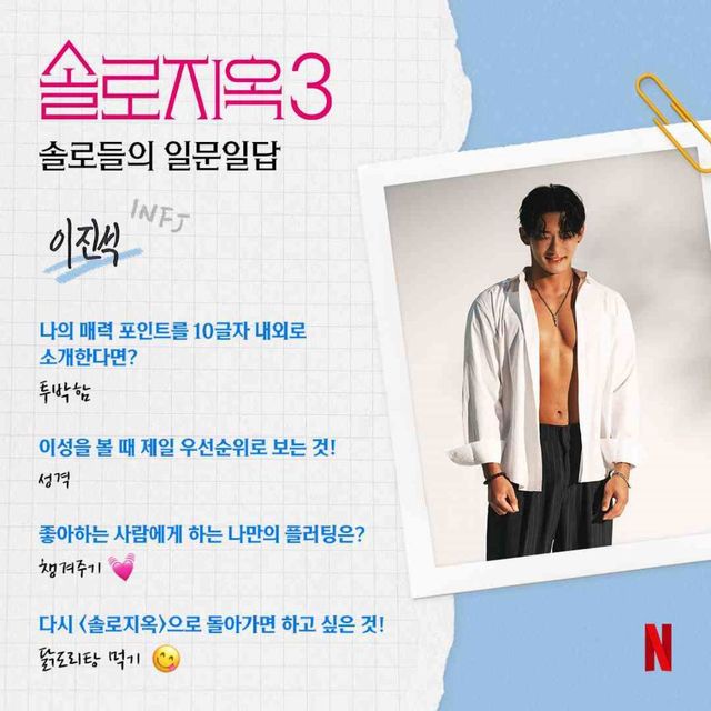 넷플릭스는 지난 4일 이들 12명의 이색 프로필을 공개해 눈길을 끌었다. 공개된 일문일답에는 출연자들이 직접 작성한 문답들이 담겨있어 시선을 사로잡았다. 자필로 쓴 이름부터 MBTI, 매력 포인트, 이성을 볼 때 우선순위 등 다양한 문답들에 솔로들의 다채로운 개성이 담겨있다.