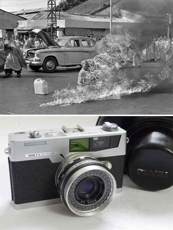 1963년 6월 11일 남베트남 정부의 불교 박해에 항의하며 소신공양 한 틱꽝득(Thich Quảng Đức) 스님의 모습. 말콤 브라운은 이 사진을 일제 페트리 카메라로 찍었으며, 당시 압도적인 모습에 어떤 노출값을 사용했는지도 기억이 안 난다고 인터뷰 한 적이 있다.