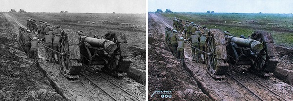 1916년 9월, 제 1차 세계대전 당시 진흙 속에서 6인치 야포를 끌고 가는 영국군