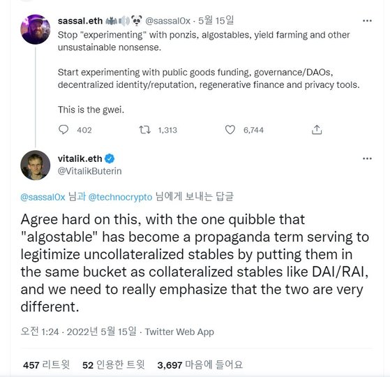 이 시기에 이미 이더리움 창시자 비탈릭 부테린부터 영국의 경제학자 프랜시스 코폴라 등 여러 전문가들은 루나의 위험성을 경고하며 권도형과 논쟁을 벌여 불확실성에 대한 시그널이 노출되었다.