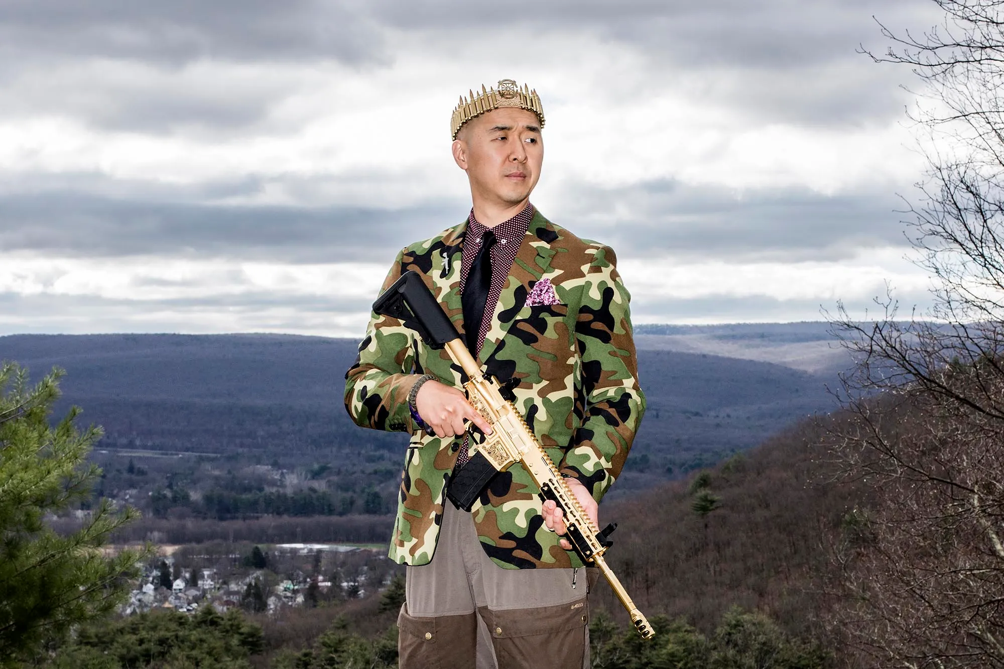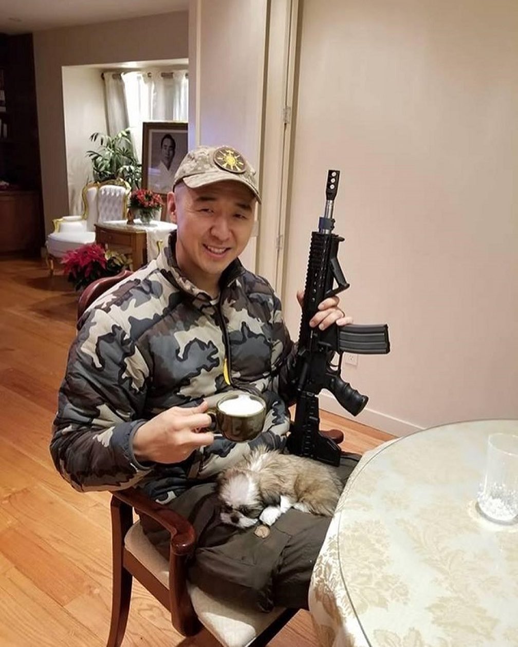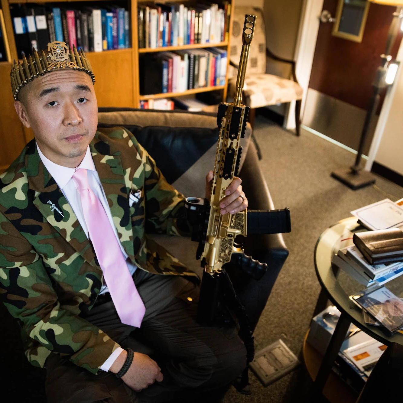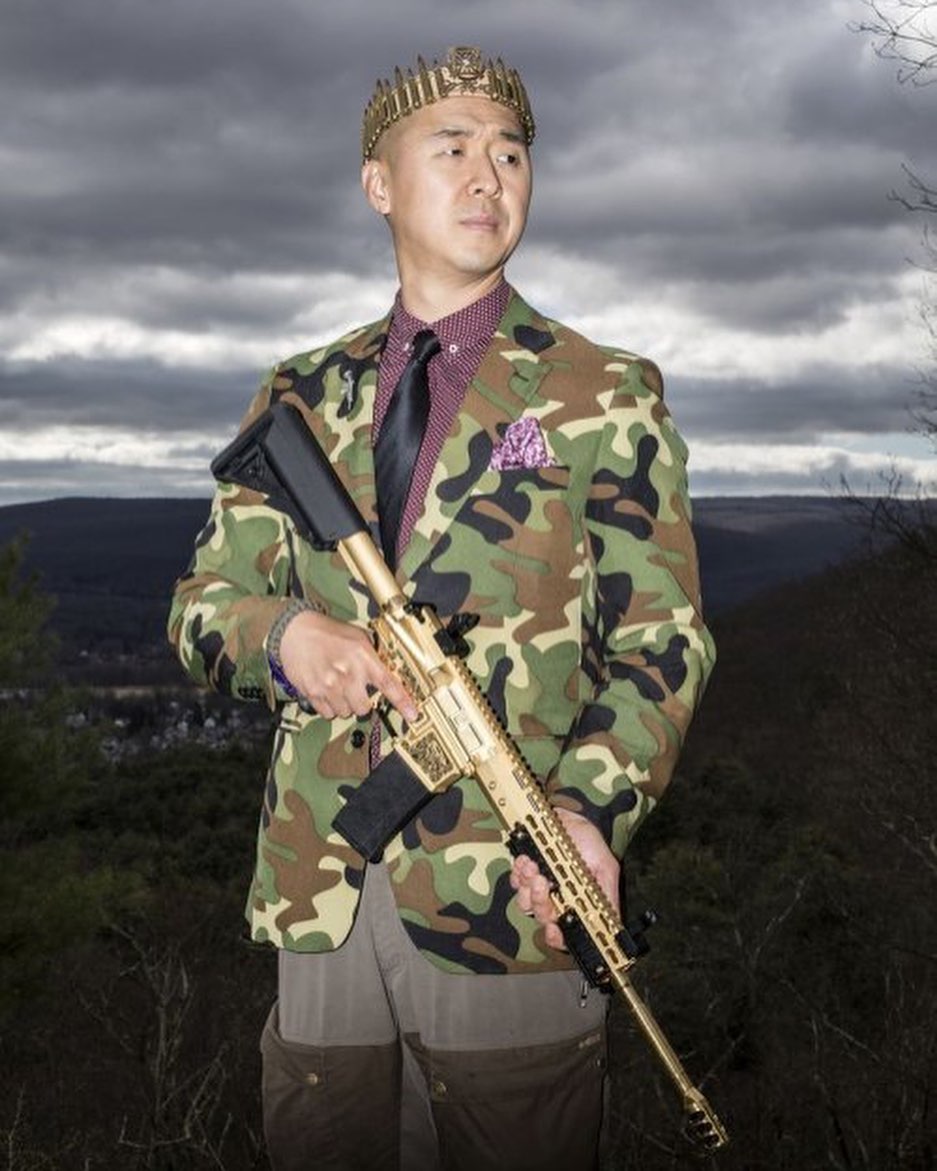 탄환으로 제작한 왕관을 쓰고 "전능하신 신이 무기를 소지할 수 있도록 부여한 권리를 통해 서로를 보호하고 인류를 번성시킬 것이다!" 라고 말했다. 그는 밀리터리 덕후이고 이베이에서 구입한 카모 정장을 자주입으며 밀리터리를 사랑하고 과시하지만 군대는 미필이다. ㅋㅋㅋㅋ